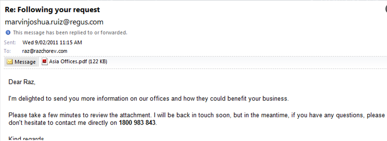 This was, as I mentioned before, about a year ago. Recently I was on the lookout for a new office, and have been considering a serviced office, in Sydney CBD. a quick Google Search, and I found several providers. I clicked on the first result which looked like what I was looking for, and was redirected to their website. Regus is one of the largest operators in the world, in that area, so when it stated on the website “Quote in less than 30 minutes”, I gladly filled in the form.